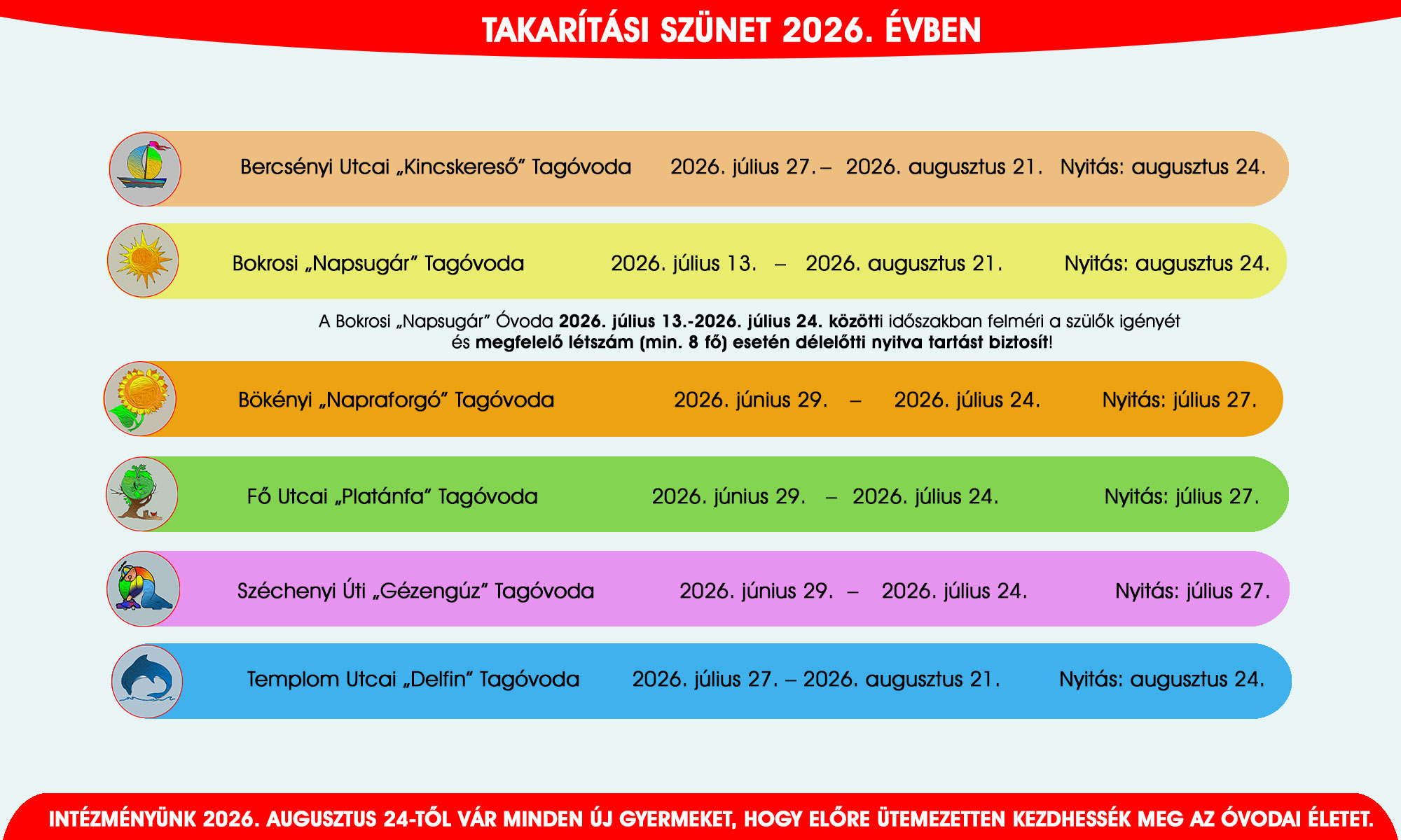 Tájékoztatjuk Önöket a Csongrádi Óvodák Igazgatósága minden tagóvodájának takarítási szünetéről, hogy időben tervezni tudjanak Önök is a nyári szünetekkel.