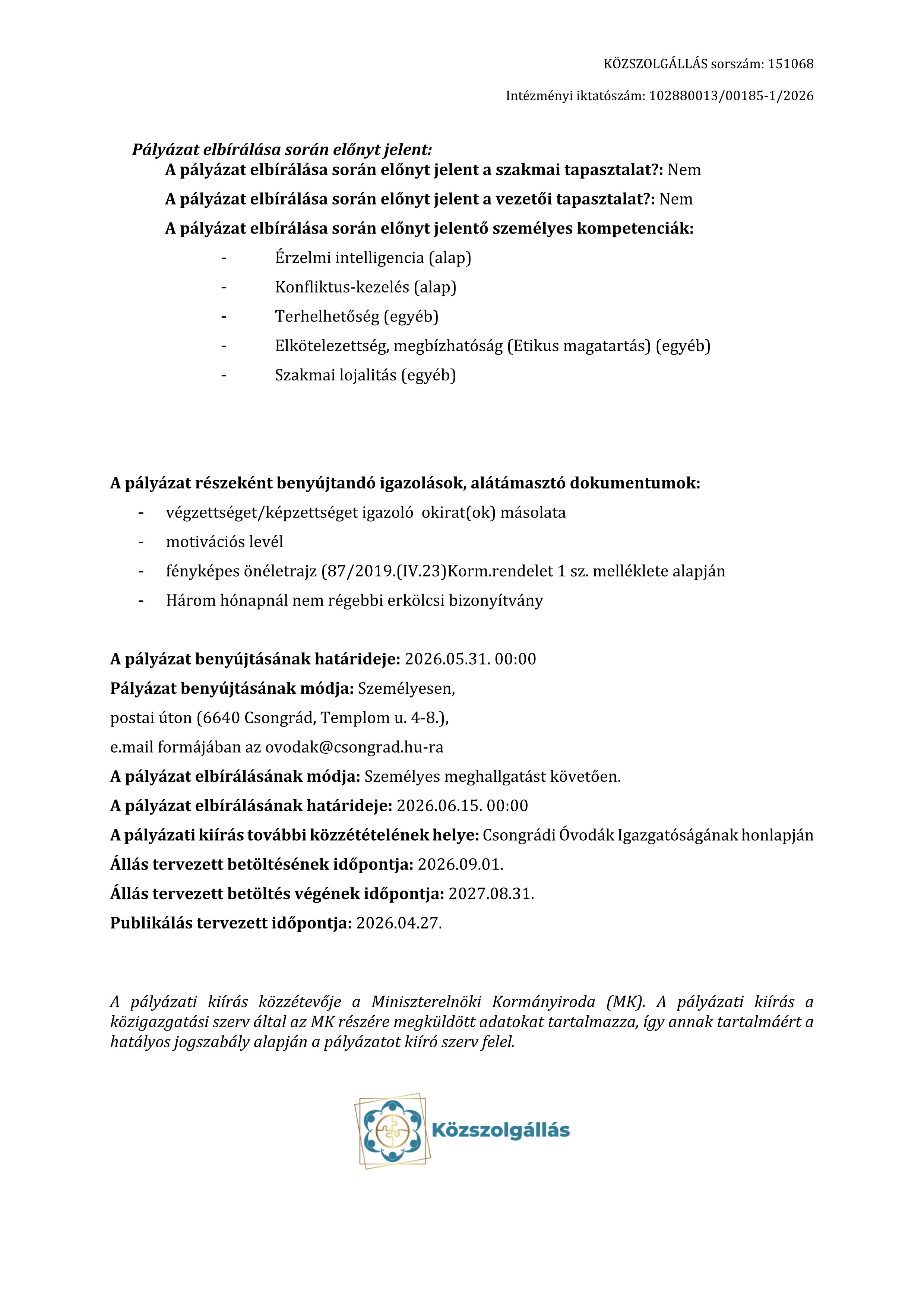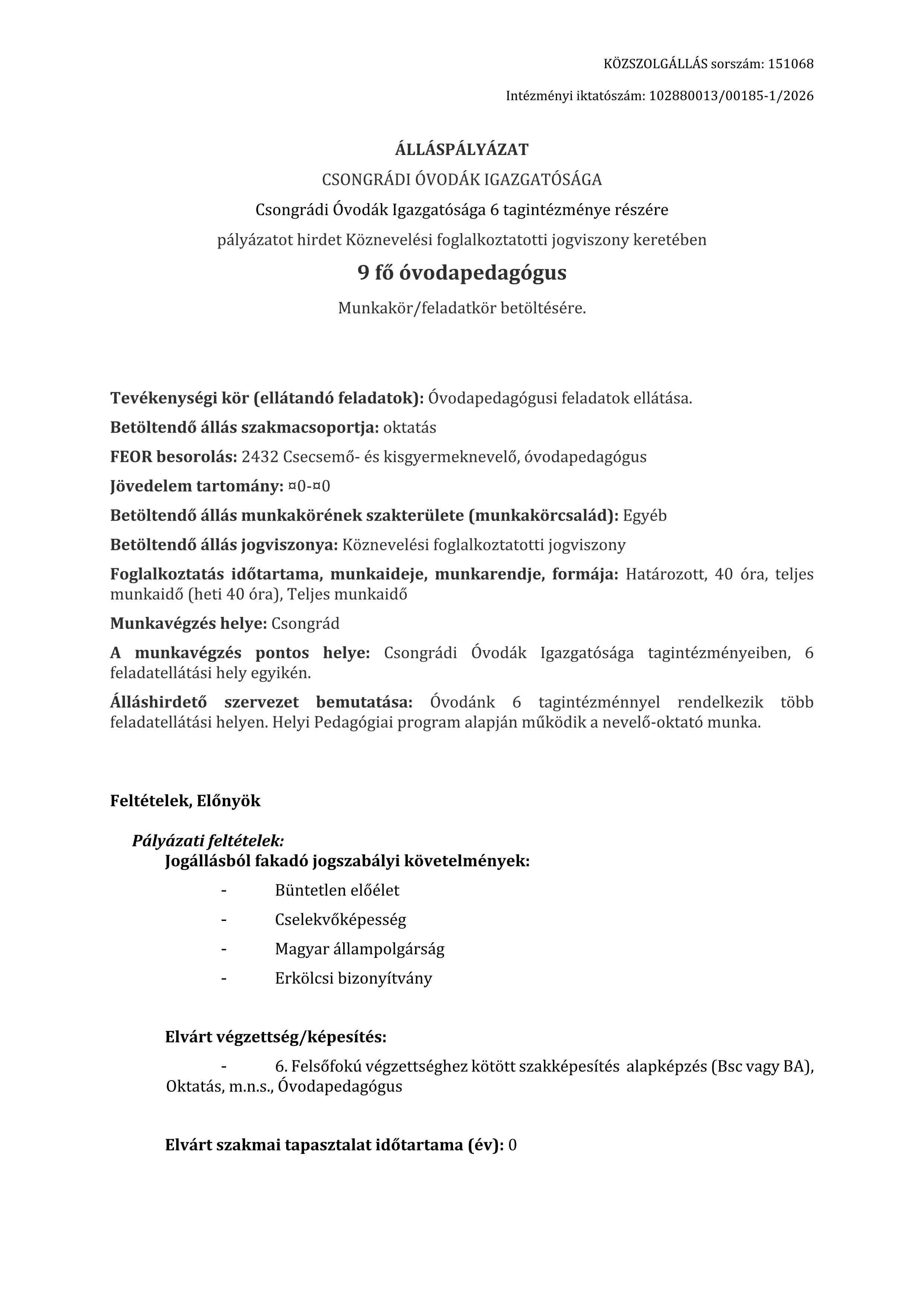 pályázatot hirdet Köznevelési foglalkoztatotti jogviszony keretében