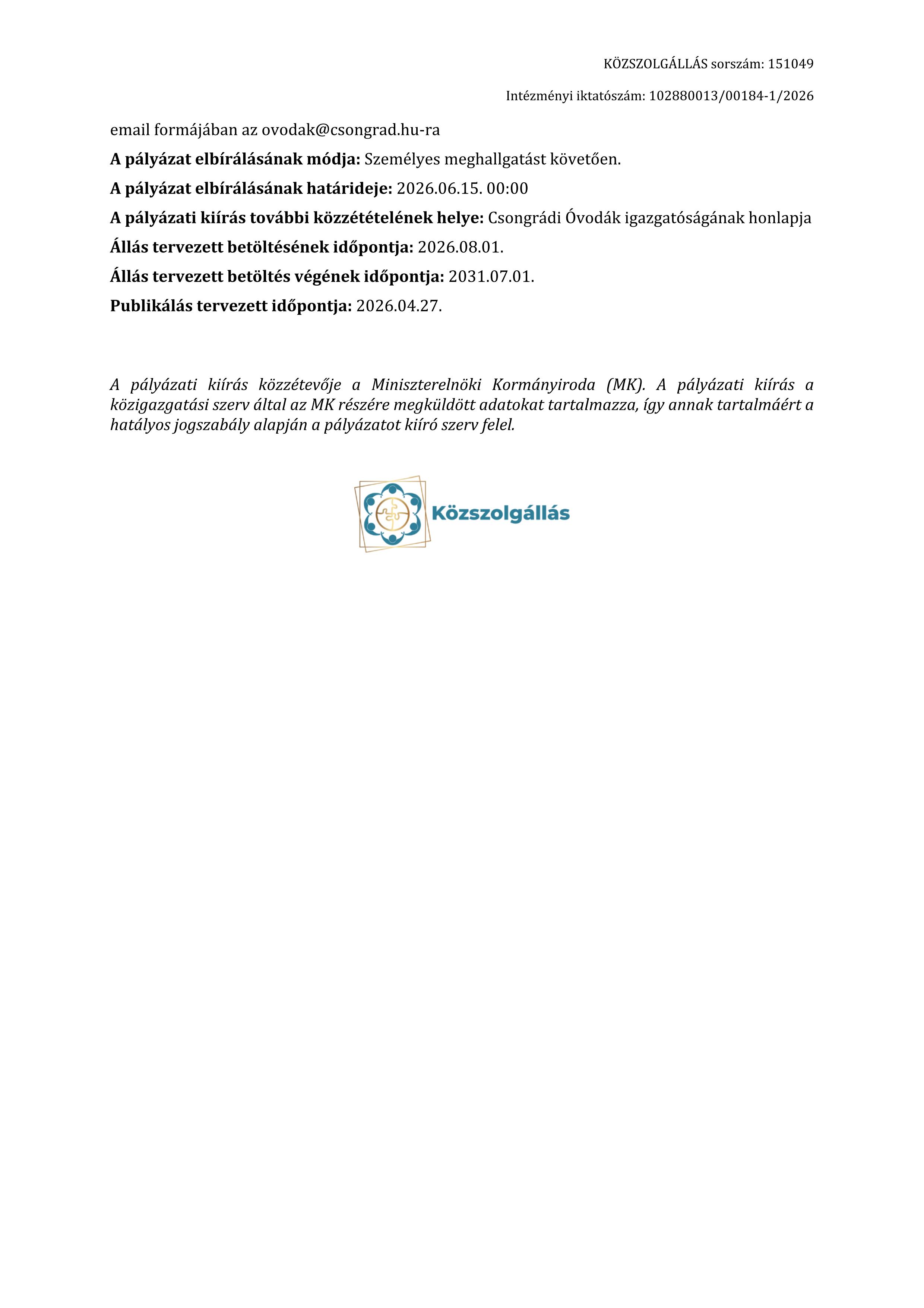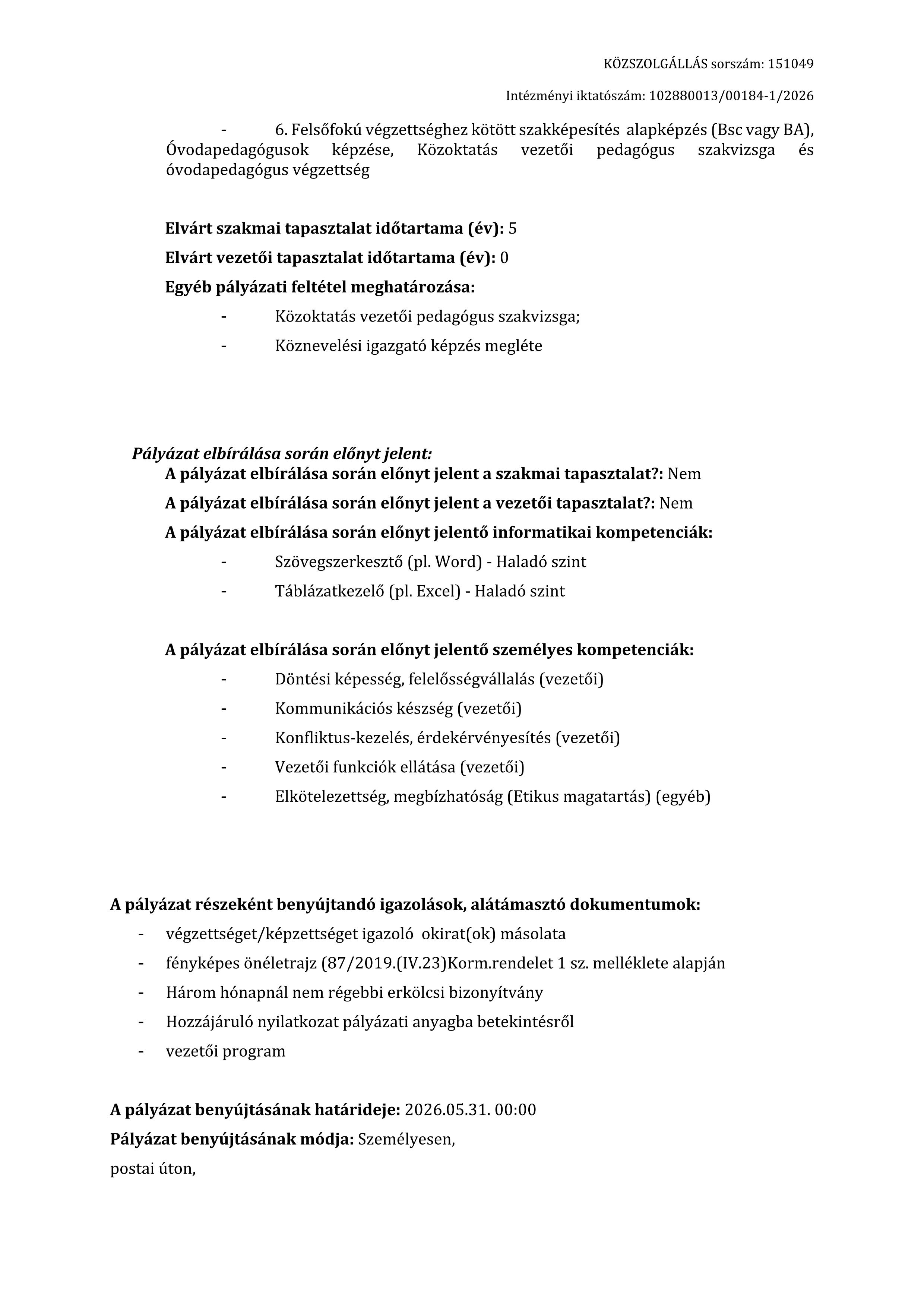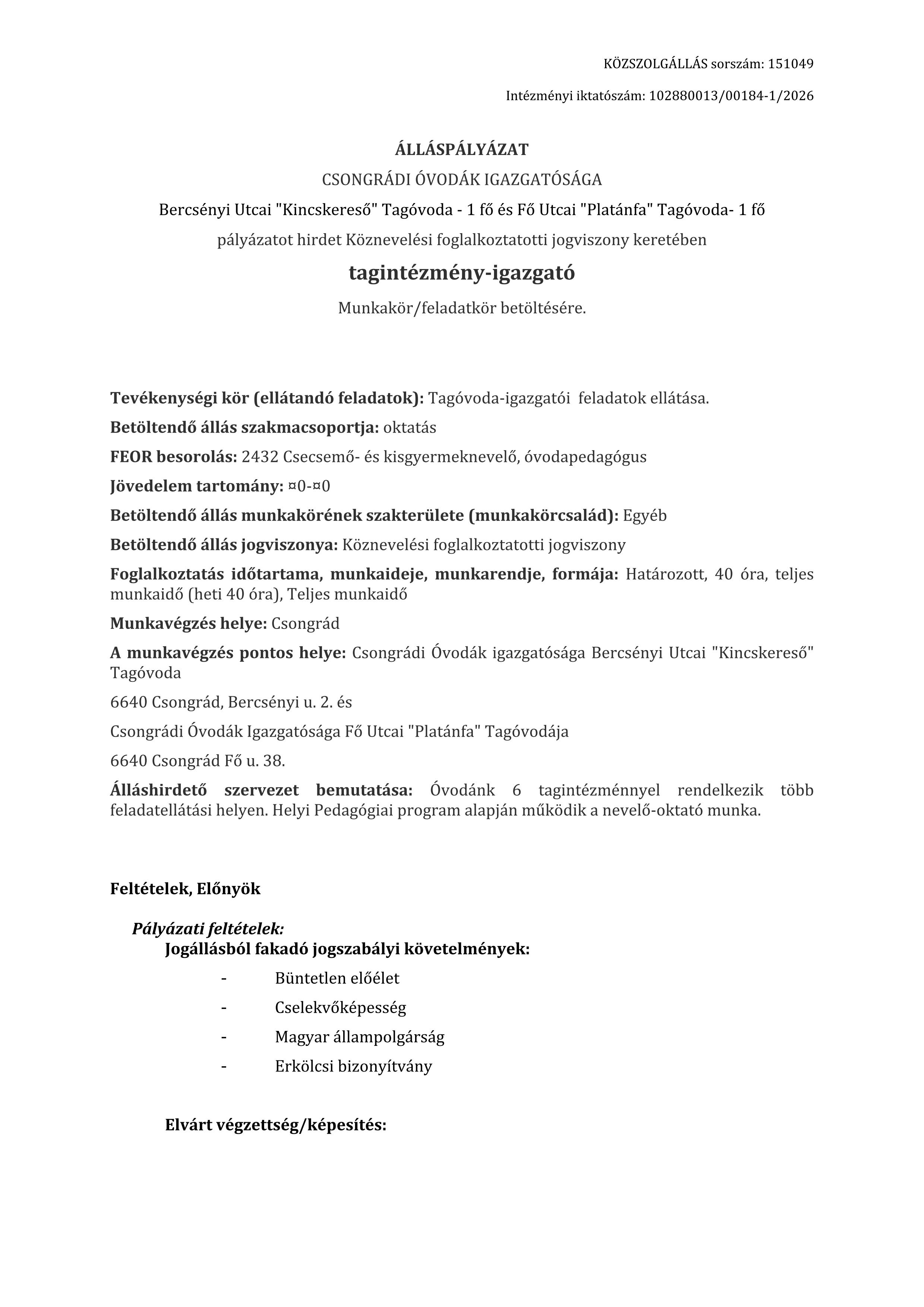 pályázatot hirdet Köznevelési foglalkoztatotti jogviszony keretében